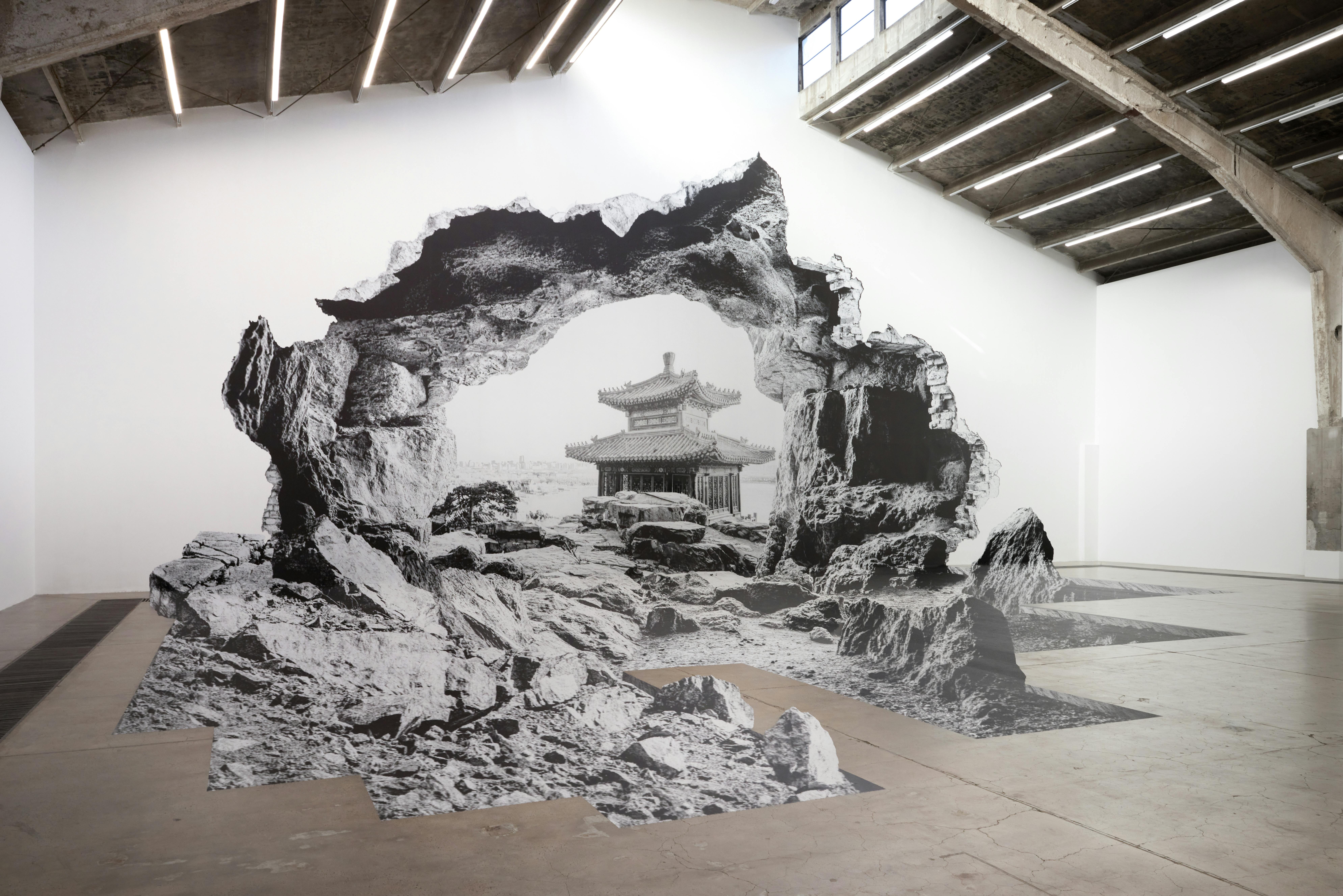 L’exposition s’ouvre sur une installation anamorphique conçue pour le lieu. Depuis un point marqué au sol, le mur de la galerie semble se fissurer, laissant apparaître au loin un pavillon du Palais d’Été de Pékin.