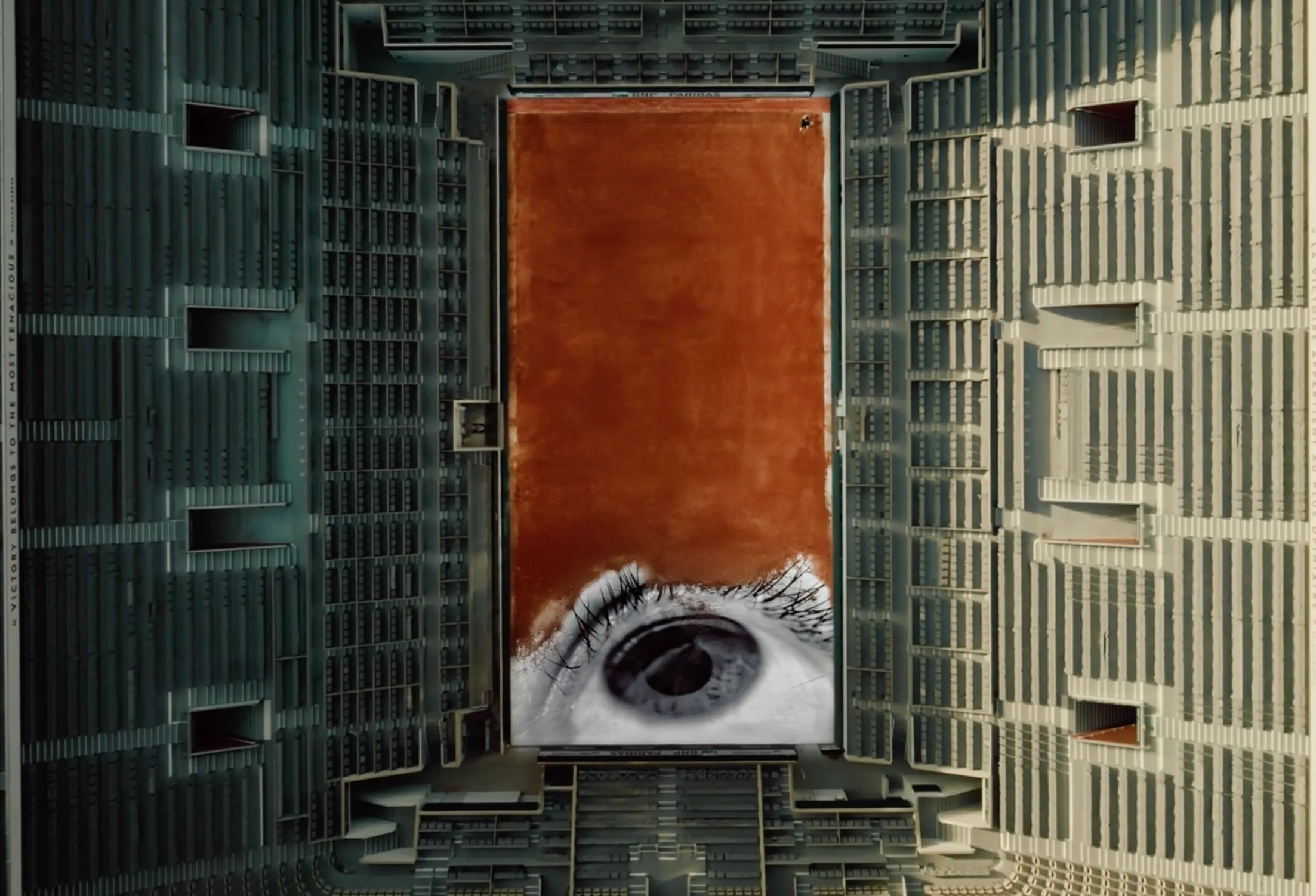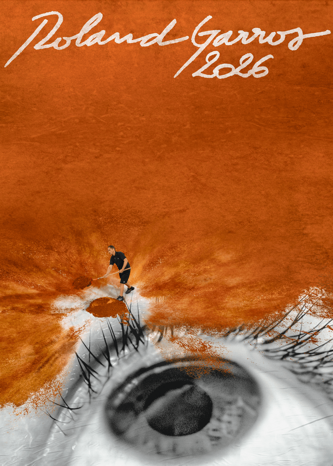 As part of his research, JR attended the 2025 tournament, immersing himself in the world of Roland Garros. Among everything he observed, one ritual stood out: the spreading of clay before a match. Typically out of sight, before the cameras turn on and the crowds arrive, this graphic and ceremonial action inspired JR's creation of the official poster for 2026. Merging the clay with the eye, a symbol he is best known for, JR brought together the texture of the court and his signature visual language.